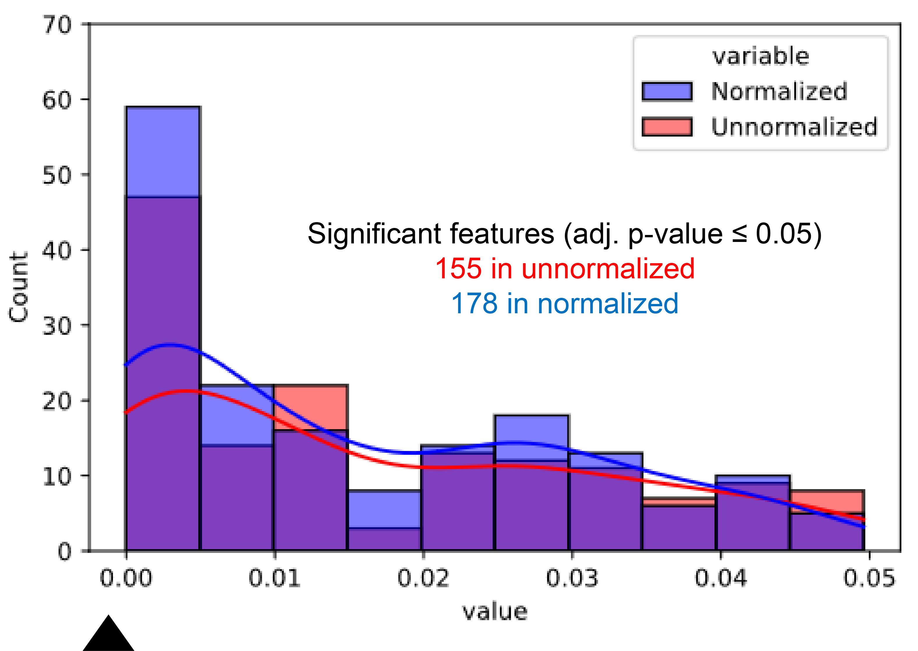 图1:A) 未归一化(红色)和归一化(蓝色)对照样本的叠加,以及B) 未归一化(红色)和归一化(蓝色)VX暴露样本的叠加。两个图表中的曲线都是密度线。