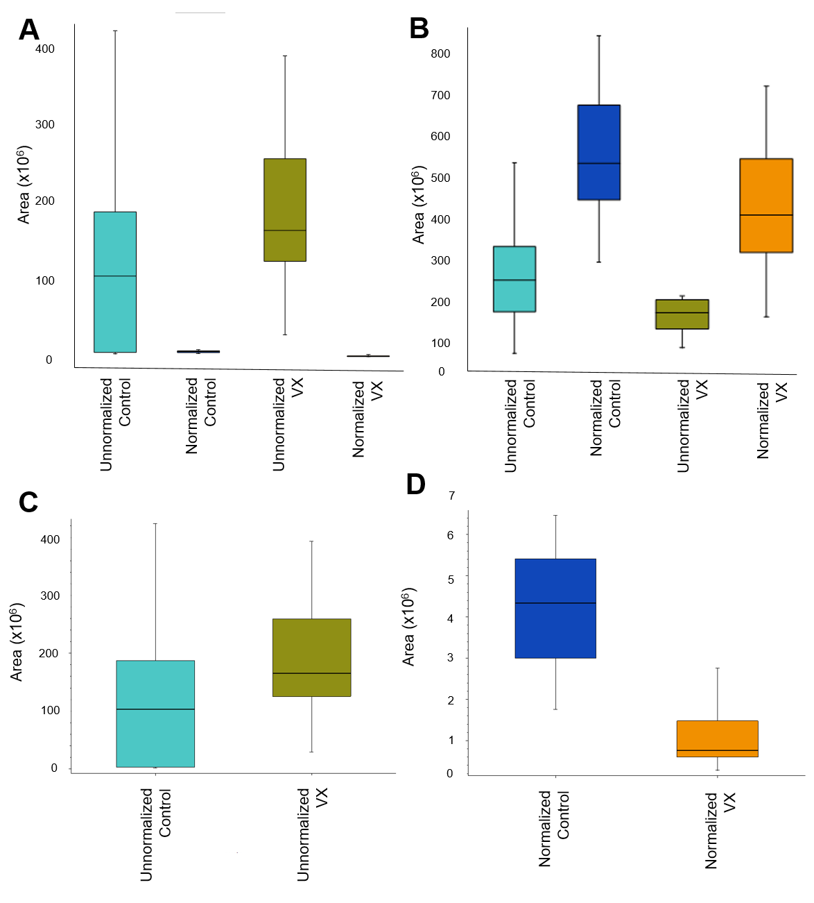 图 3:A) 未归一化和归一化样本中的1,3-二甲基丁基胺,B) 未归一化和归一化样本中的L-谷氨酸,C) 仅在未归一化样本中的1,3-二甲基丁基胺,D) 仅在归一化样本中的1,3-二甲基丁基胺。