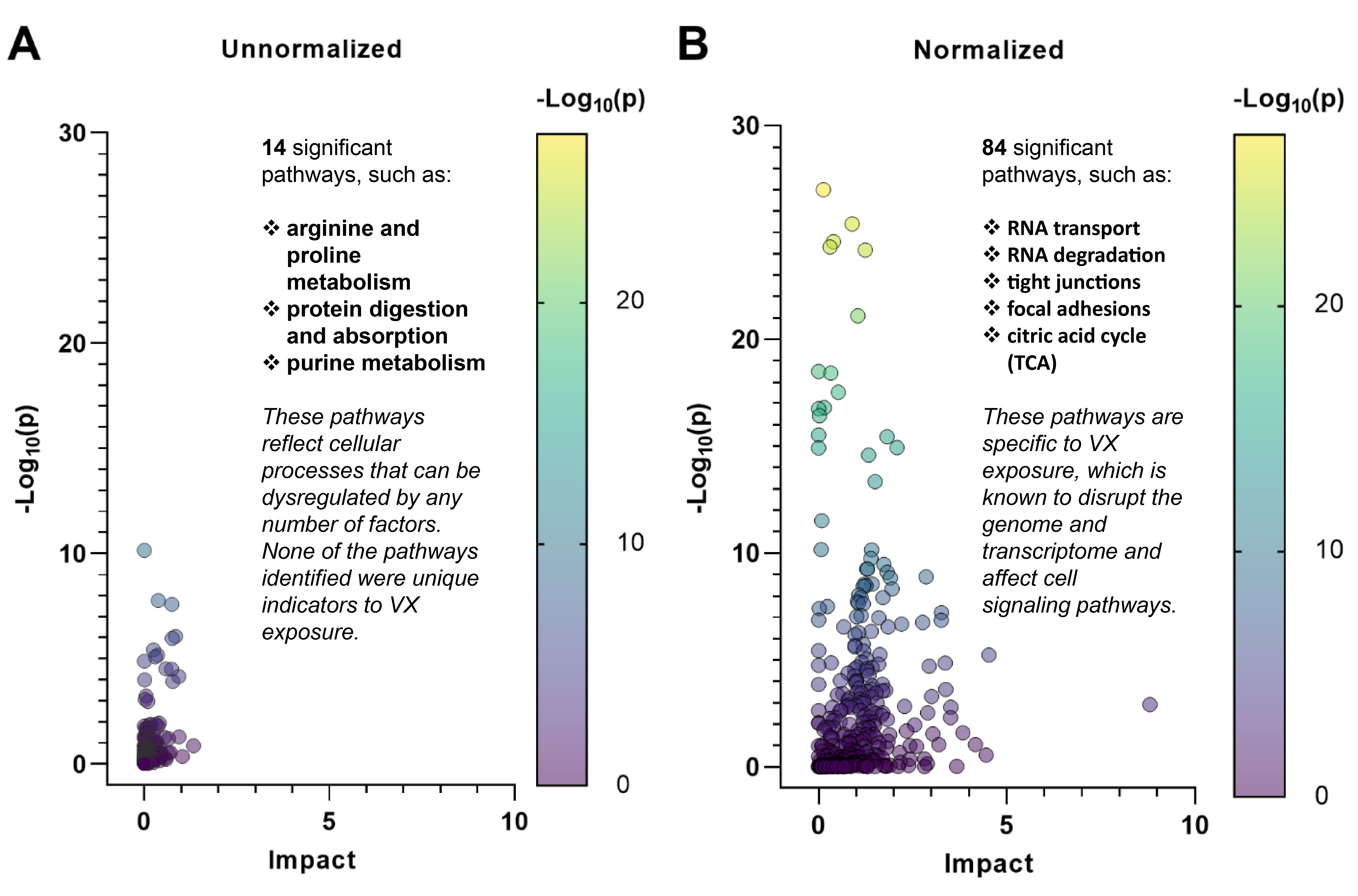 4、对被定义为显著的蛋白质组学和代谢组学数据(调整后的p值≤0.05)进行Joint Pathway分析。包括未归一化(A)和归一化(B)样本。归一化样本结果显示,有更多与VX暴露生物学相关的通路显著富集。