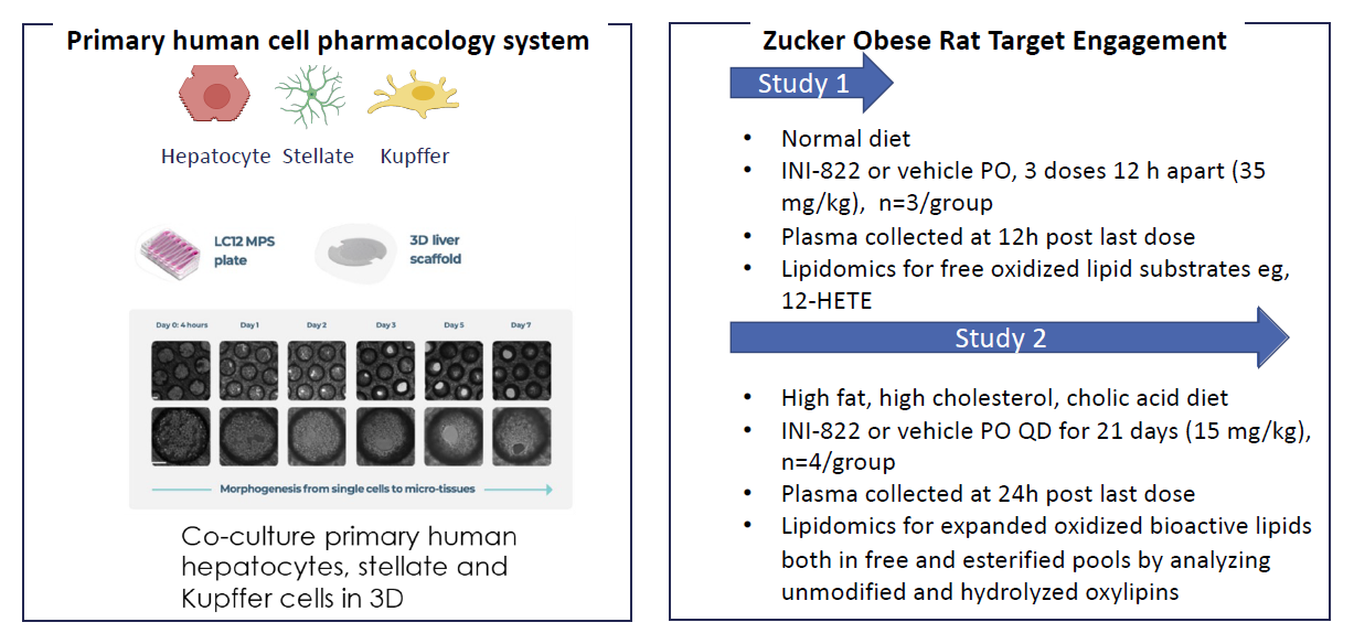 INI-822在8到10周大的Zucker肥胖大鼠中口服给药。在肝脏芯片的培养基和Zucker肥胖大鼠的血浆中,通过液相色谱/质谱法进行INI-822浓度、代谢组学(Biocrates)和氧化脂质的脂质组学(West Coast Metabolomics Core/UC Davis)分析。