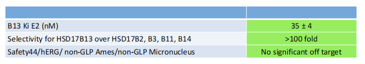 INI-822以低nM级的强度抑制HSD17B13。INI-822对其他HSD17B家族成员以及包括hERG在内的安全性和ADME靶点具有超过100倍的选择性。肝细胞的稳定性支持在原代肝-芯片系统中进行测试。INI-822在小鼠、大鼠和狗中的清除率低,口服生物利用度良好;建模支持适合每日口服剂量的药代动力学。两种动物的7天毒性学试验已完成。