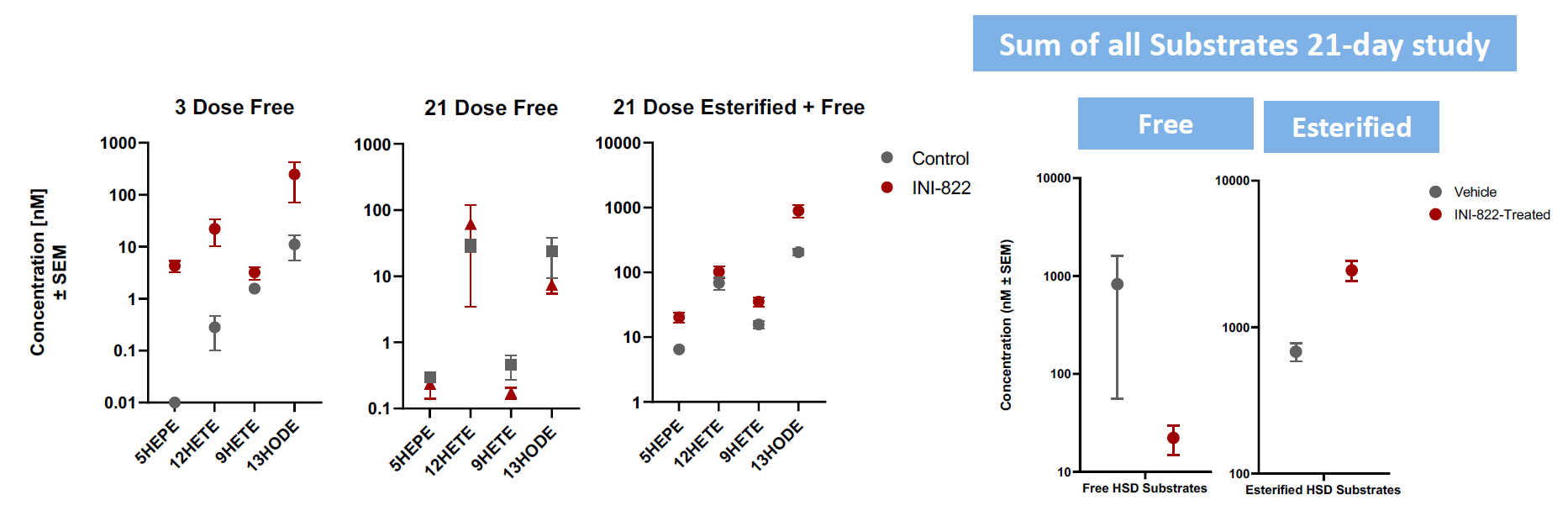 4、INI-822对HSD17B13底物和产物的体内评估证实,INI-822抑制后底物水平初期增加的是游离氧脂质,随后是酯化的氧脂质。
