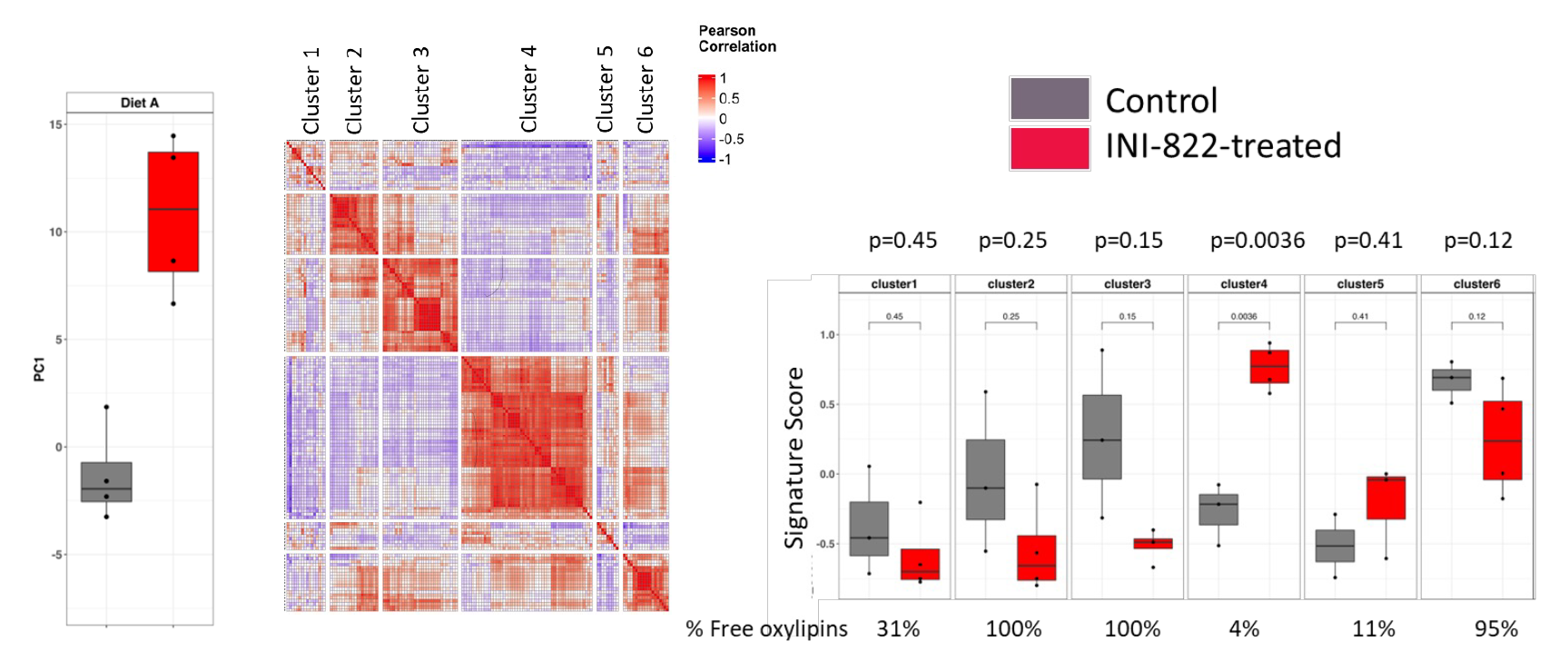 图5.INI-822口服给药增加 Zucker 大鼠中酯化池中的生物活性氧脂质底物。急性阶段,自由状态的多个已知底物上升,但在3周的给药后,酯化的12-HETE和酯化底物上升,而自由状态的底物相对于接受惯用治疗的大鼠的血浆减少。未显示的数据:INI-822对三酰甘油的影响无变化。主成分分析确定了对INI-822有响应的一个主成分(PC)。层次聚类分析确定了6个生物活性脂质簇,它们在INI-822的作用下聚在一起。其中,Cluster 4 包含已知的 HSD17B13 底物,在INI-822给药后较大增加,主要由总的(酯化+自由)氧脂质组成。