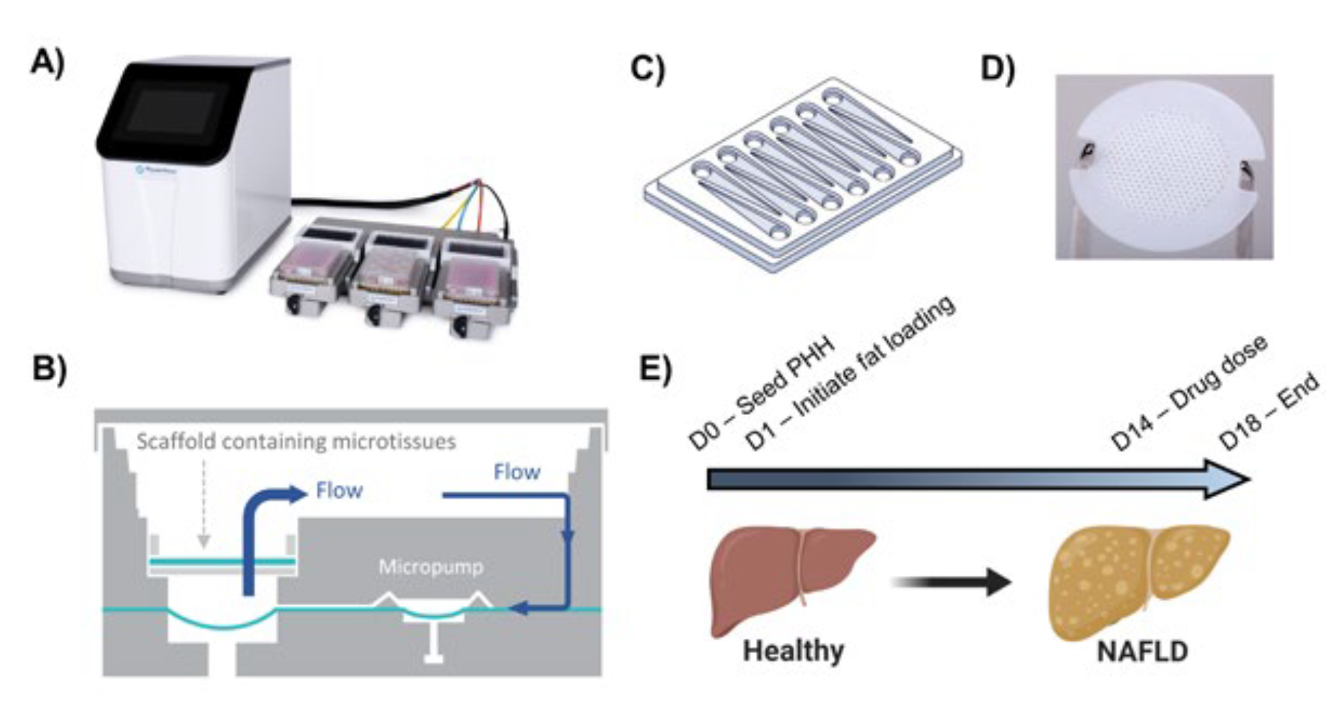 A)体外模型利用PhysioMimix OOC细胞培养系统,该系统使用开放孔板设计,用于在工程支架中以3D方式培养原代肝细胞。B)在LC-12肝芯片板上的单个培养孔的示意图。C)LC-12多孔板的示意图。D)在整个实验过程中,将持续对固定在平板上每个孔中的支架连续灌注细胞培养基,以提供生物力学刺激和氧气供应(3)。E)通过在高脂肪培养基中培养PHH长达28天来生成NAFLD模型。为了研究DILI,在负载脂肪14天后才给与化合物剂量。