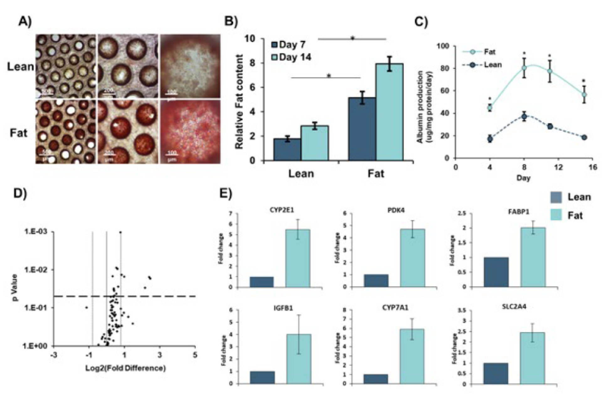 PHH在高脂和无脂条件下培养14天。通过微组织的Oil Red O染色测量脂肪负荷,并使用Liver RT2 Profiler PCR Arrays比较基因表达。A)对细胞进行细胞内脂肪积累成像,B)通过在510 nm处的吸光度进行定量,并与总蛋白质含量标准化处理。C)通过ELISA定量白蛋白产生,并且低脂和高脂培养之间的基因表达变化D)通过倍数变化> 1.8和P = <0.05来划定标准。E)高脂与低脂条件下关键基因表达的倍数变化。数据是来自9个独立培养物的mean±SEM(每种情况三个供体,每个供体n = 3个样品);* = P <0.05。数据取自Kostrzewski等以前的发表文献2017(3)。