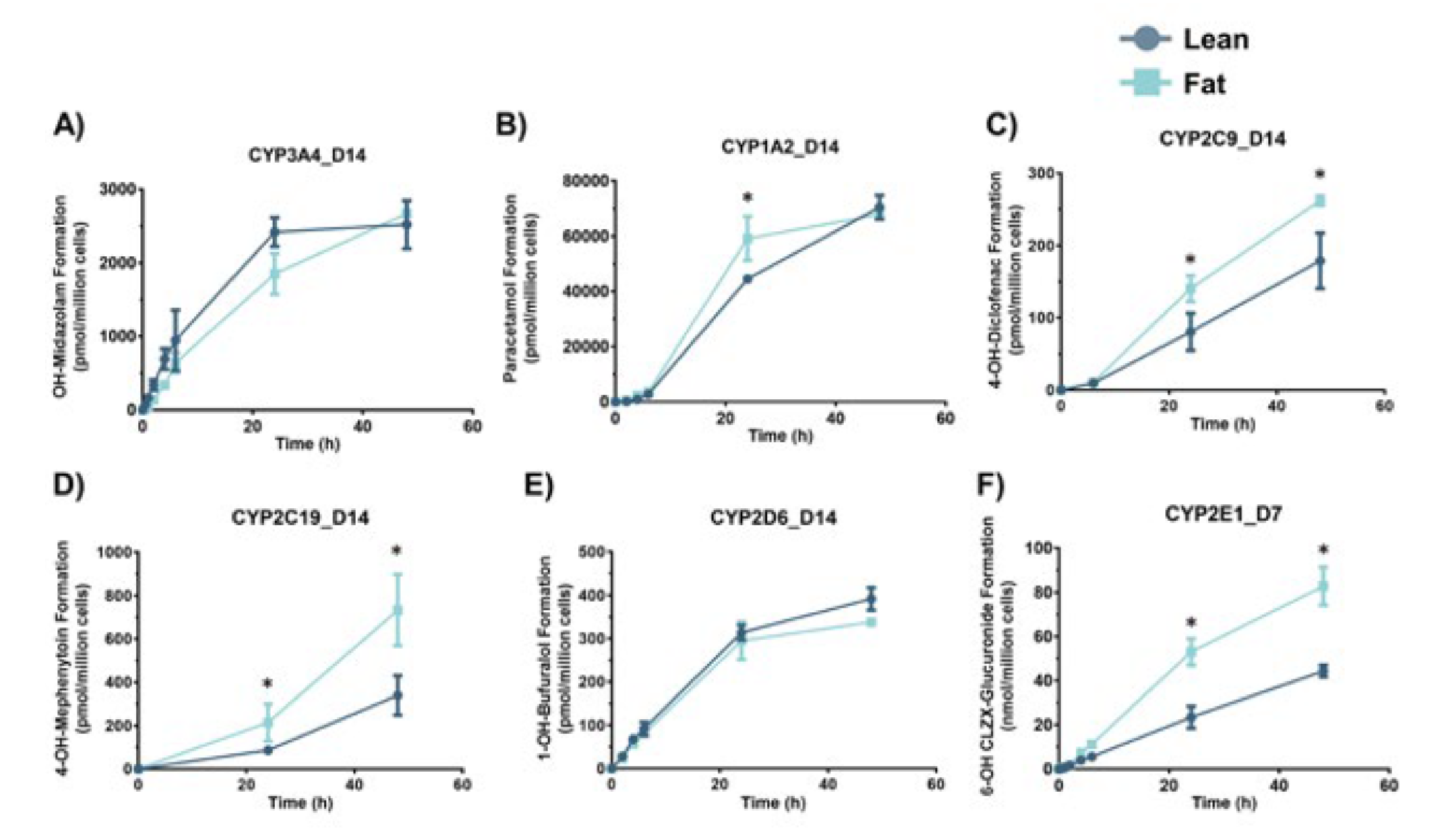 图3 - PHH在高脂条件下培养14天,然后加入探针化合物以评估关键CYP-450酶的代谢活性。通过在48小时内产生phase I代谢产物来确定每种酶的活性。使用LC-MS和代谢物的标准曲线定量代谢物的存在。各化合物均在第14天给药,除了CLZX(CYP2E1目标)是在第7天给药。各数据均为至少n = 3。* = P <0.05。