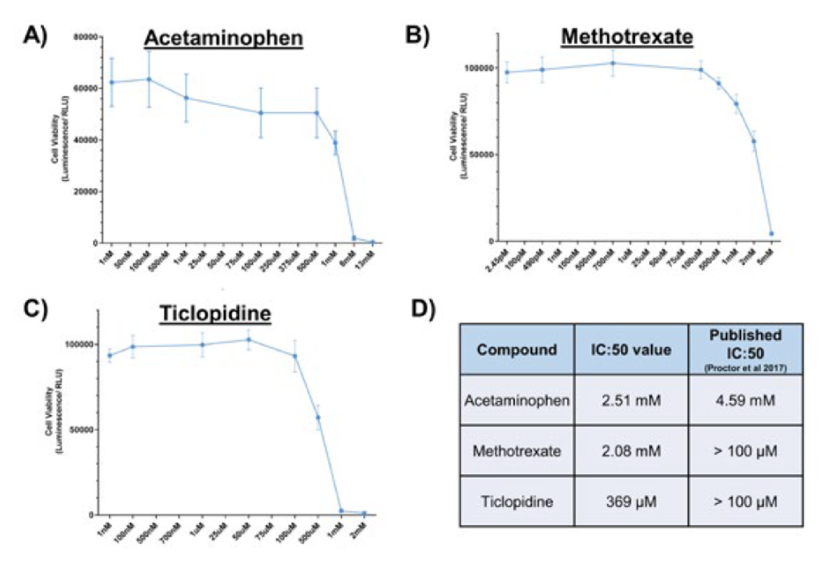 图4 - 在低脂培养基条件下,将PHH在胶原蛋白包被的96孔板上培养72小时。在使用Cell Titre Glo评估细胞活力之前,将它们暴露于不同浓度的A)对乙酰氨基酚,B)甲氨蝶呤和C)噻氯匹定48小时。D)生成每种化合物的IC:50值并将其与公开数据进行比较(4)。所示数据为mean±SD,最. 小为N = 4。