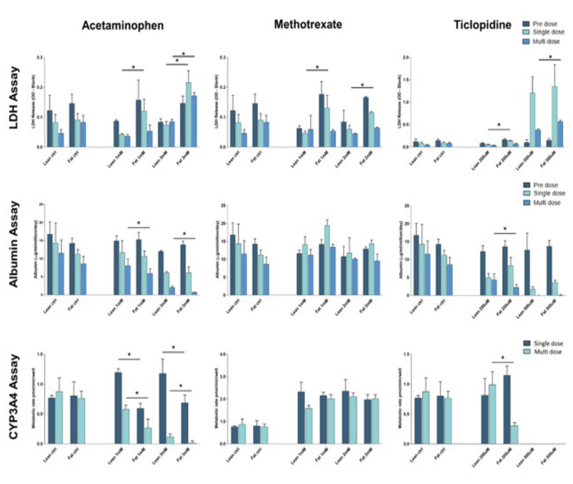 对乙酰氨基酚和噻氯匹定在脂肪负载的细胞中引起更多的过度的DILI反应,导致LDH释放增加,减少白蛋白的产生并降低CYP3A4活性(作为细胞活力的一种度量)。当化合物多次给药到肝组织上时,这些变化通常更为明. 显。在负载脂肪的肝细胞存在下,甲氨蝶呤给药似乎不会引起DILI。这些数据共同证明了MPS平台和相关的NAFLD模型如何捕捉早期阶段的关键特征,并展现出临床上观察到的对于DILI的一系列反应。