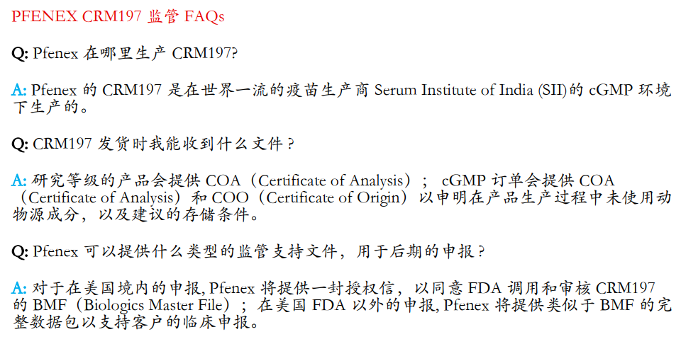Pfenex的CRM197是使用 Pfenex Expression Technology平台在荧光假单胞杆菌中生产的重组形式的商业用途的CRM197,可提供cGMP等级,已用于批准上市的结合疫苗。