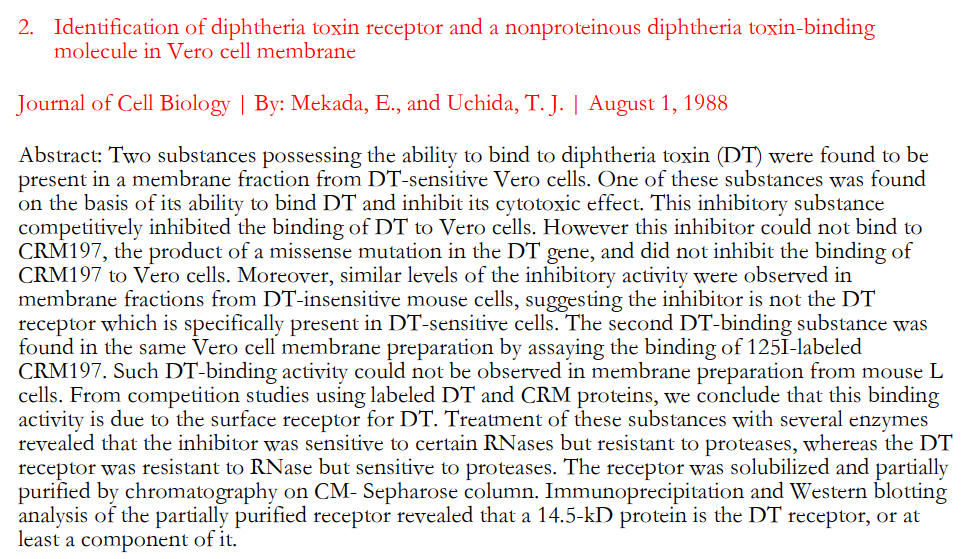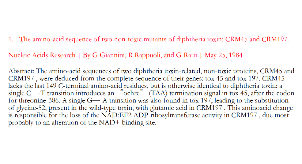 发布时间:2023/10/18 点击数:1046 CRM197 是一种将52位的甘氨酸替换为谷氨酸的单一突变的无毒性的白喉毒素突变体(文献1,2),致使白喉毒素酶活性位点发生改变,从而不能对细胞产生毒性作用,但在抗原性和免疫原性上仍和天然白喉毒素保持一致。CRM197 是一种研究明确的蛋白质,作为多糖和半抗原的载体使其具有免疫原性。它被用作一种载体蛋白,用于许多已经被批准的疫苗,比如脑膜炎球菌、乙型流感嗜血杆菌和肺炎球菌感染的结合疫苗。