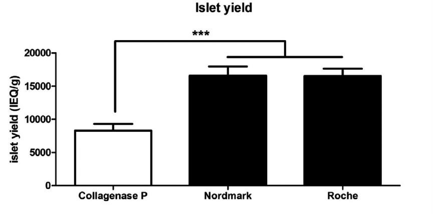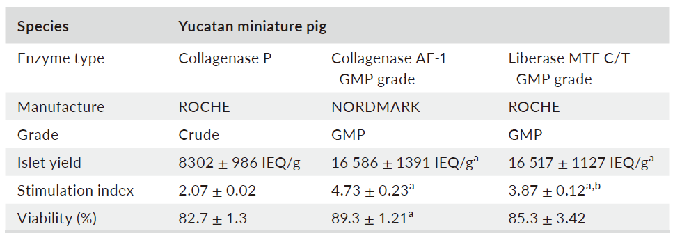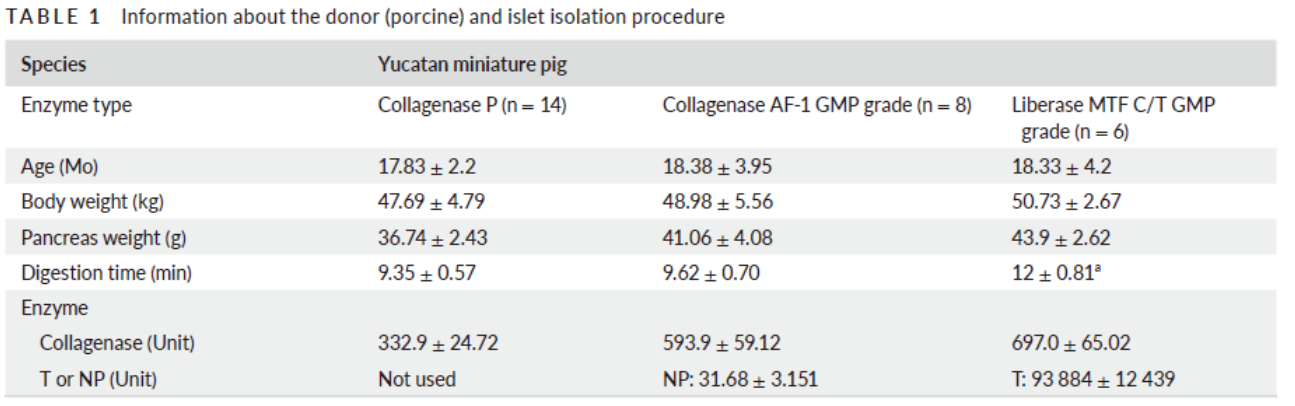 本篇中实验人员评估了两种 GMP 胶原酶:德国 Nordmark 的 GMP 级胶原酶 AF-1 GMP 以及 Roche 的 Liberase MTF C / T GMP 级和标准非 GMP 胶原酶 P(Roche) 在猪胰岛异种移植过程中用于胰岛组织解离的胰岛质量控制方面的比较。