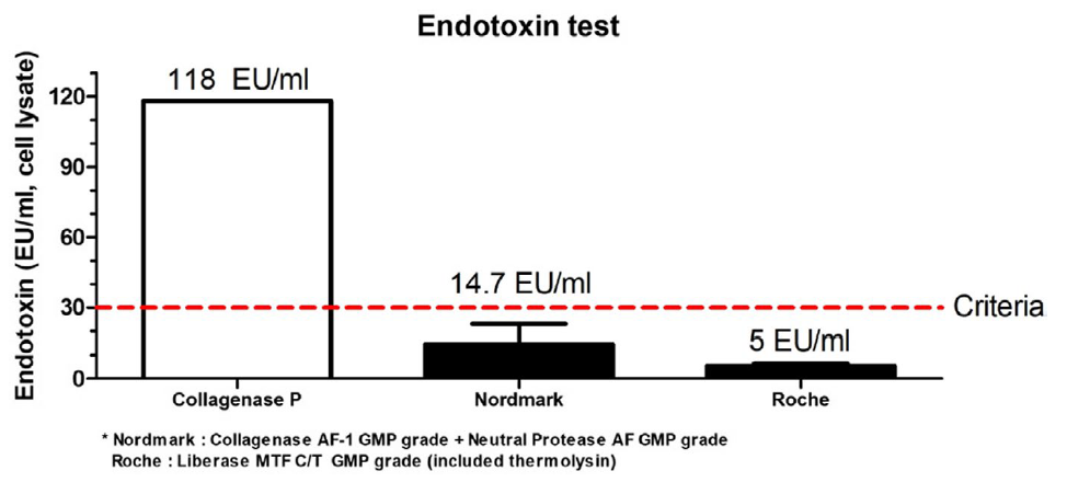 内毒素浓度测定采用 Pierce LAL 显色内毒素定量试剂盒,分离的胰岛在冰中被声波探测了30秒。溶解后的细胞在冰上孵育 10 分钟检测内毒素水平。与胶原酶P相比,两组 GMP 级胶原酶分离得到的胰岛组织的内毒素水平均显著降低,符合低于 30 EU/mL 的标准。