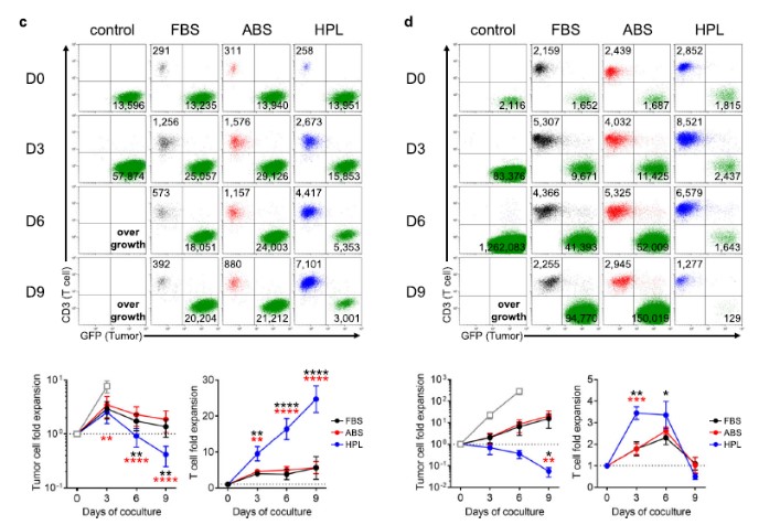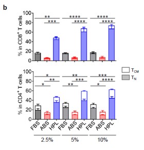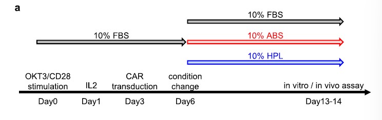 以上两种不同CAR模型的研究中,由于hPL培养组的T细胞始终优于ABS或FBS对应的T细胞,所以研究者试图确定具体影响T细胞表型的成分。