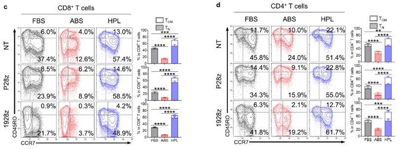 图1c和1d:P28z和1928z两种T细胞在FBS/ABS/hPL不同的培养体系中扩增时TN/TCM的比例