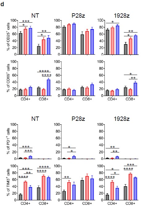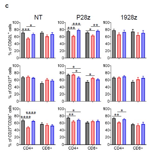 此外还探索了与记忆(CD62L, CD127, CD27和CD28)、激活(CD25和CD69)和抑制(PD1和TIM3)相关的其他细胞表面marker的表达。hPL扩增的细胞中CD25、CD69、PD1和TIM3的表达增加,而ABS扩增的细胞中CD25、CD69、PD1和TIM3的表达降低((图S1d), 而在ABS中扩增的细胞在CD8+和CD4+ T细胞亚群中CD62L+表达较低,以及非转导T细胞(NT)、P28z和1928z中CD4* T细胞中CD27*CD28*群体数量的减少(图S1c)。