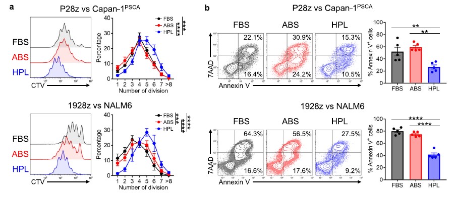 图3a&3b:FBS/ABS/hPL组CAR - T细胞增殖和抗肿瘤反应的影响:P28z或1928z T细胞用CTV染色,分别与Capan-1PSCA或NALM6共培养5天,使用CellTrace Violet (CTV)进行细胞增殖试验和检测凋亡细胞。