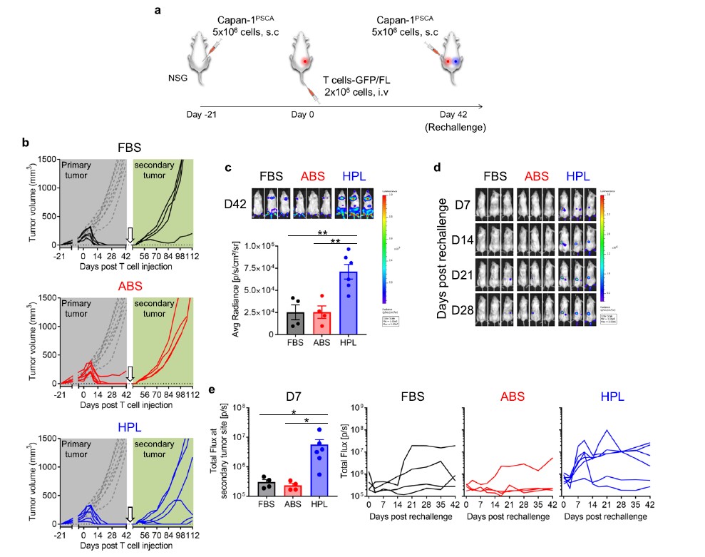 进一步研究在体内hPL培养组的细胞是否表现出更好的持久性和保护能力,实验人员进行了一个肿瘤复发模型实验,在该模型中对清除原发肿瘤的小鼠[在给药高剂量T细胞(2 × 106个T细胞/只小鼠)后,在对侧腹部用移植入相同的肿瘤细胞 (图5a)。在CAR - T细胞治疗42天后,我们观察到大多数动物已经消除了它们的原发肿瘤(FBS;5/5, ABS;5/6, hPL, 6/6)(图5b,灰色背景)。如图5b(浅绿色背景)所示: P28z (hPL) T细胞处理的小鼠肿瘤生长延迟 (2/6)或完全消除肿瘤(2/6) ,而P28z (FBS) T细胞处理的小鼠仅1/4小鼠肿瘤生长延迟 ,而P28z (ABS)小鼠则无对照区别。我们还正式评估了T细胞在肿瘤再发模型实验中的持久性,并发现P28z (hPL) T细胞的生物发光显著更高(图5c),表明原发肿瘤消除后的维持的持久性更长。这些P28z T细胞能够迁移到新的肿瘤部位扩增并产生细胞毒性(图5d和5e),从而延缓肿瘤生长或完全消除肿瘤。